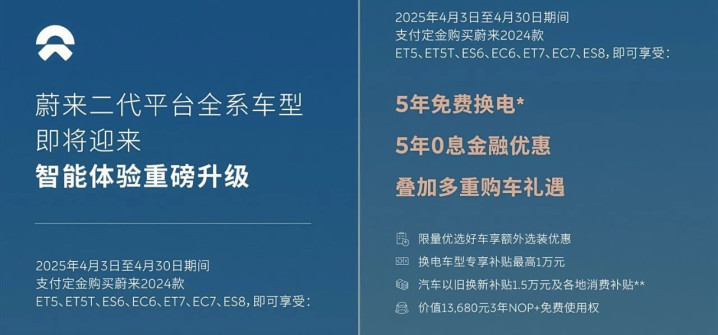 发布日期:2025-04-12 10:21 点击次数:784月4日,蔚来官方推出最新的购车优惠政策。即日起到月底,用户支付定金购买蔚来ET5、ET5T、ES6、EC6、ET7、EC7、ES8车型,均可以获赠240张免费换电券,这些换电券在5年内有效。